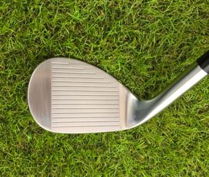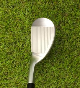 フェースの溝と溝の間にさらに細かいミーリングが施されている。これにより、スピン量はかなり多く、硬いグリーンでもピタッと止まります。グースの度合いが丁度いいから、スクエアに構えるとボールがスタンスの中央にセットされ、自然に理想的なダウンブローになる。