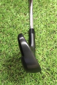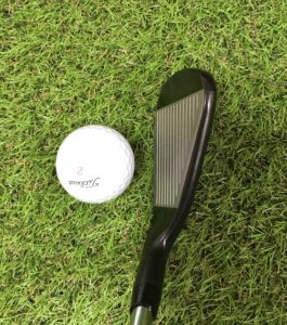 構えると、ストレートに近いセミグースネックの小顔です。普段使用してるタイトリストやミズノののアスリートアイアンから持ち替えても、違和感なく構えられる。顔は問題なしです。ブラックのカラーリングはボールに集中できるし、なかなかカッコイイ。